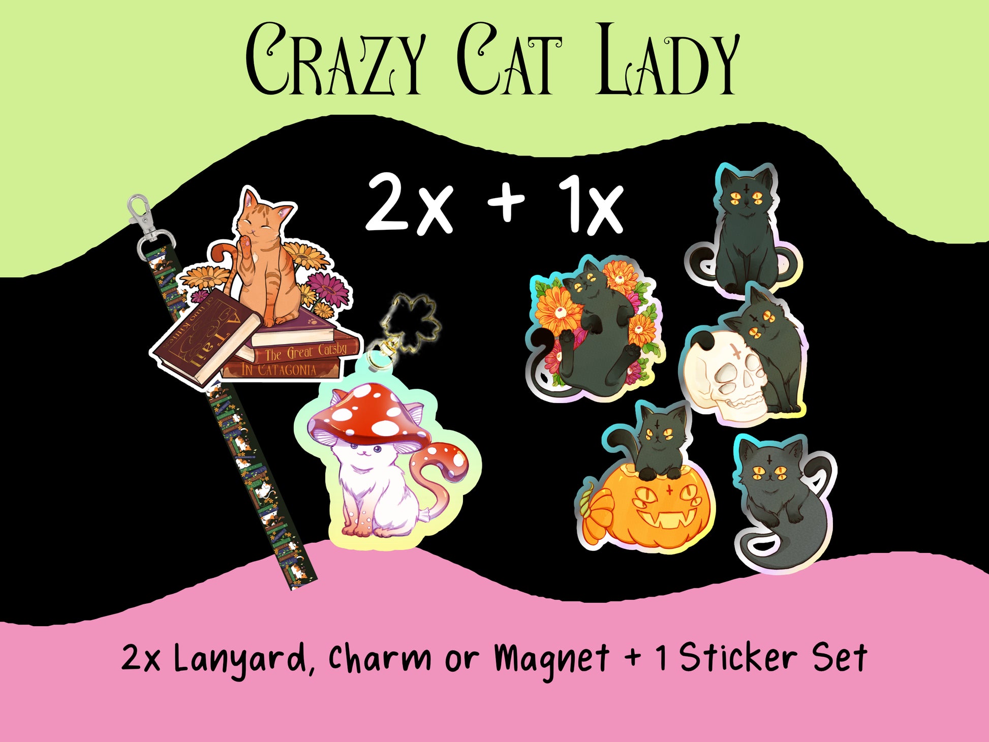Do you love cats, but is getting all the cat stuff a tad bit too pricey? This bundle is here to help. Choose 2 magnets, charms or lanyards and a sticker bundle - all for a flat price of 30€.